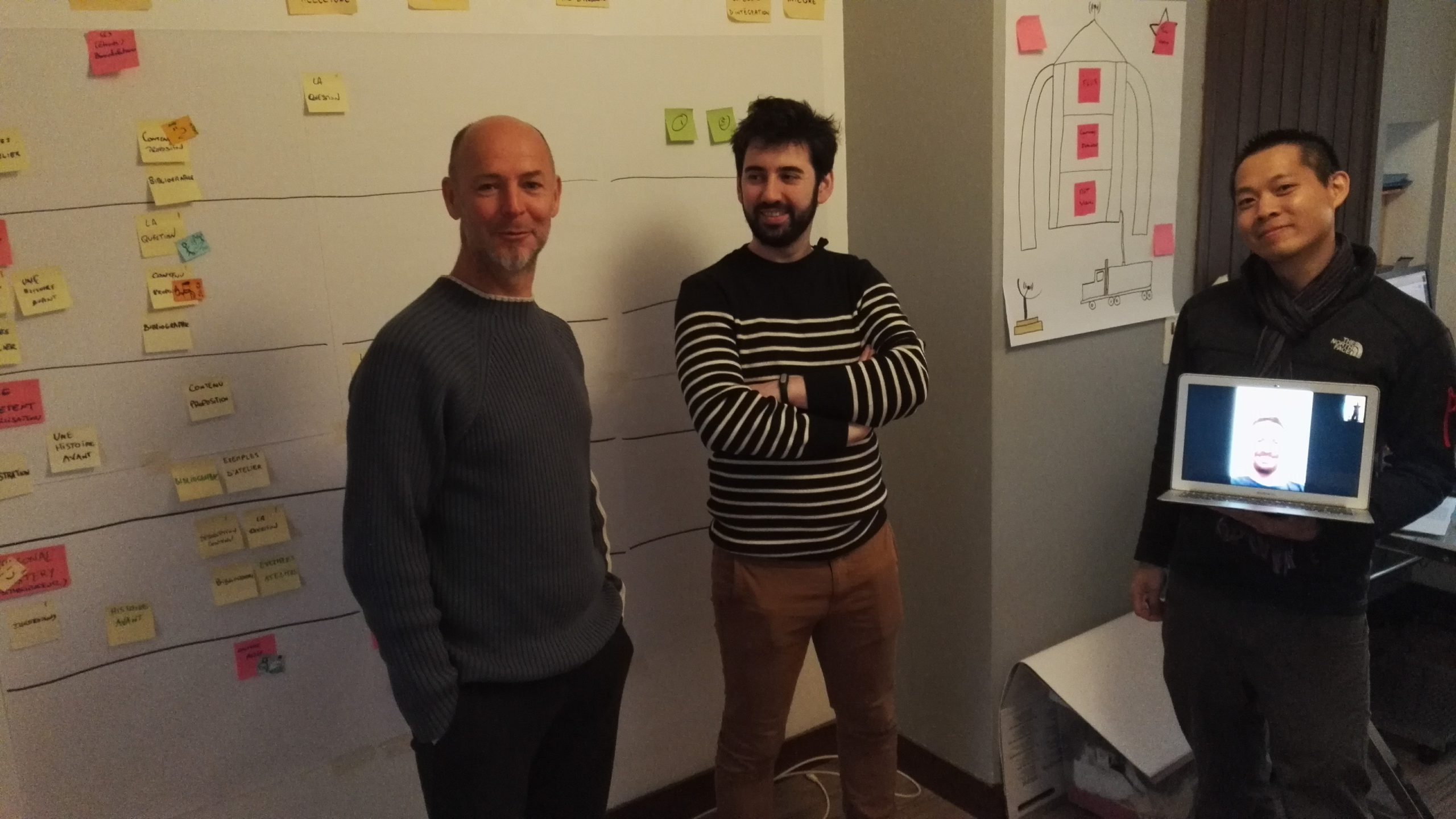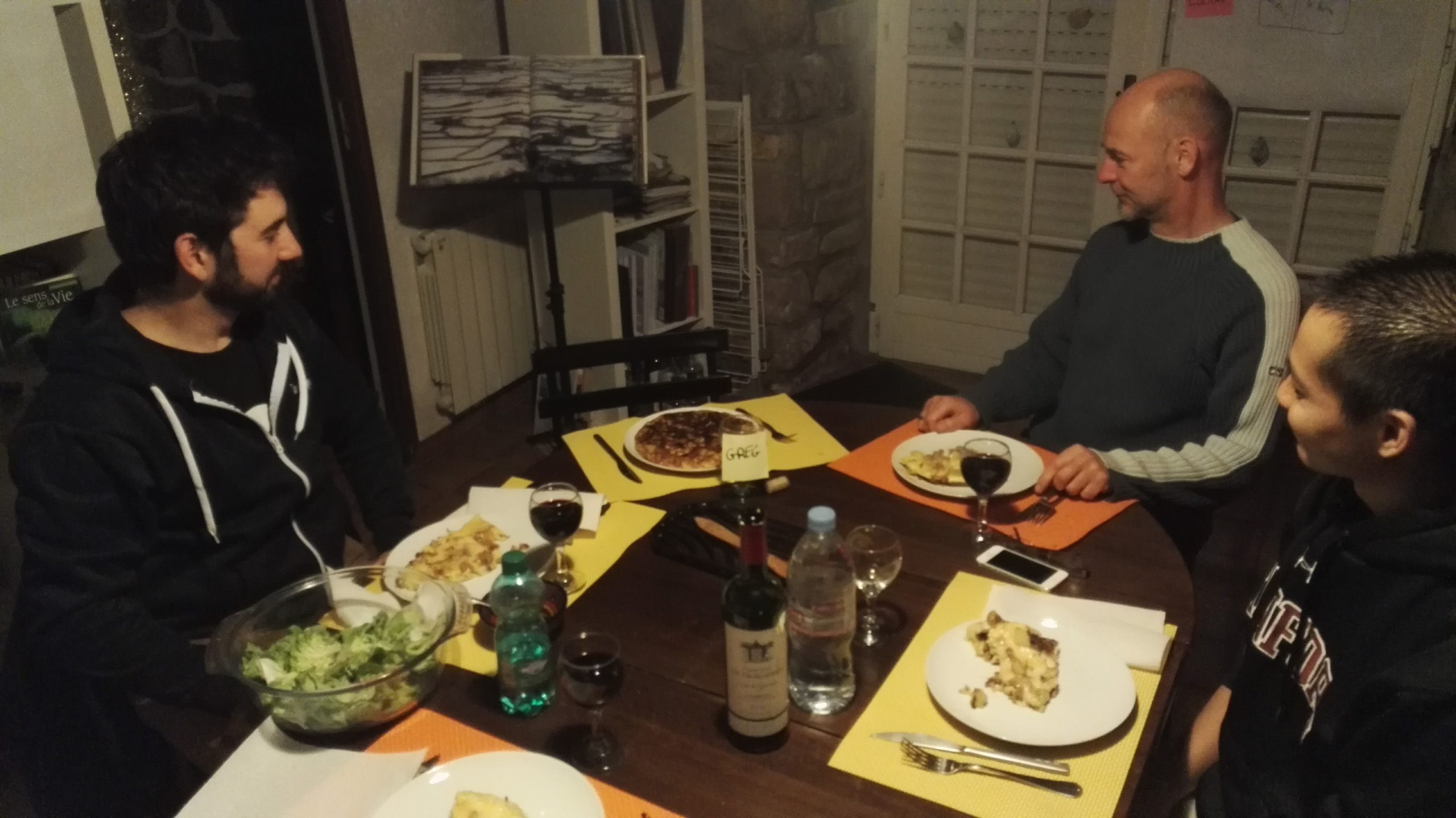 - Greg était le seul à distance, et de notre côté, il était représenté par un objet : souvent l’écran du portable d’Olivier pendant les points de synchro, parfois par un verre ou une assiette, selon le moment de la journée 🙂