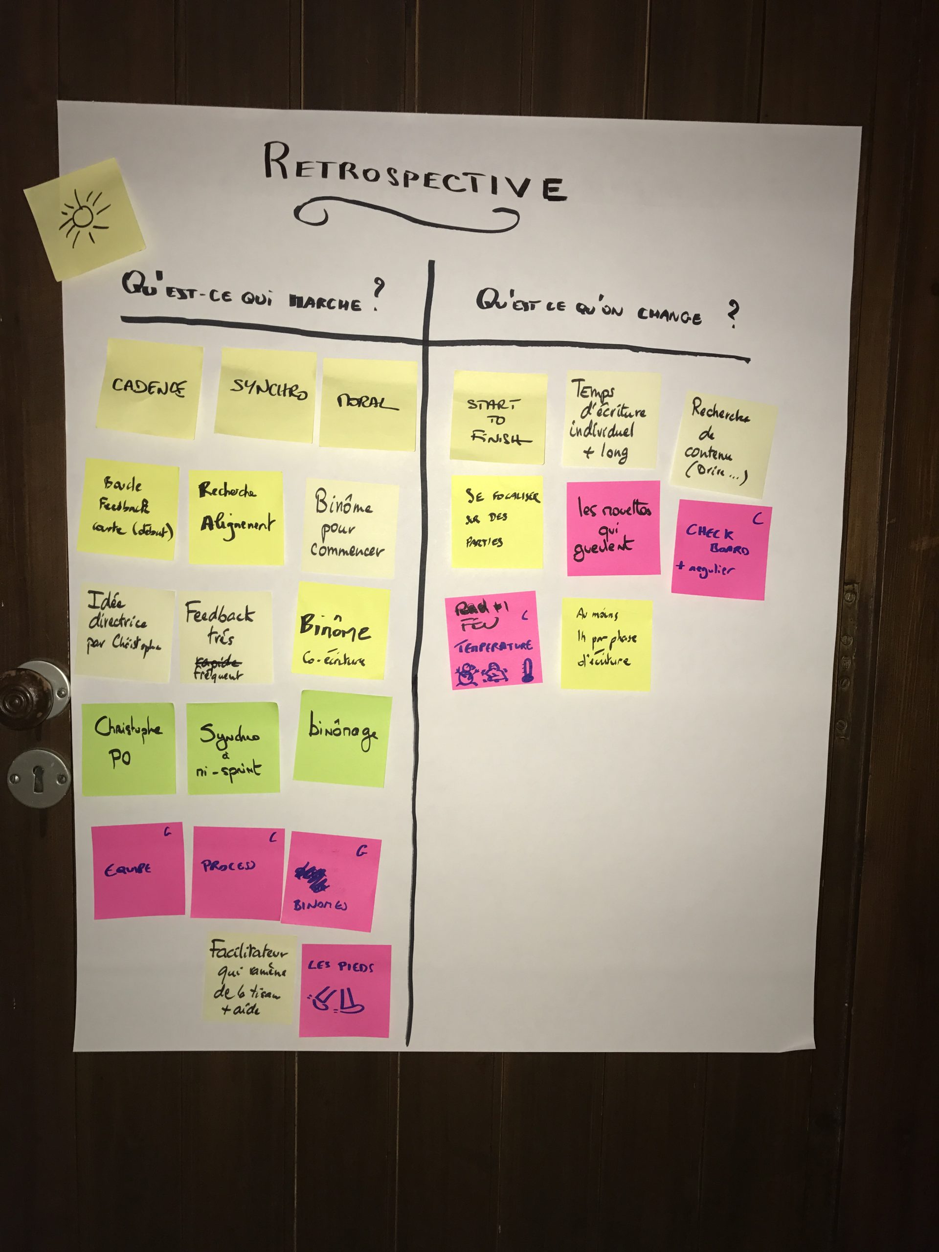 Une discussion avec Olivier le dimanche m’a renforcé dans l’idée que nous n’avions pas tous le même rythme, les mêmes besoins, et que le rythme pouvait changer pour s’adapter au plus grand nombre, par expérimentations successives. J’ai proposé ce changement lors d’une de nos rétrospectives.