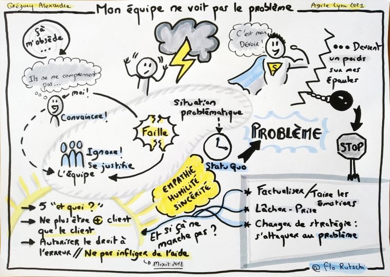 Le 4 juin 2021, je donnais ma conférence « Mon équipe ne voit pas le problème » où je présentais ces situations dans lesquelles nous voyons un dysfonctionnement s’opérer devant nous (un bug client qui reste incorrigé longtemps, une équipe qui communique mal pendant les réunions, une équipe qui saute ses rétrospectives…). On observe donc ce dysfonctionnement, on en parle à l’équipe et la réponse obtenue ne nous convient pas (l’équipe minimise, elle esquive, elle se justifie…).
